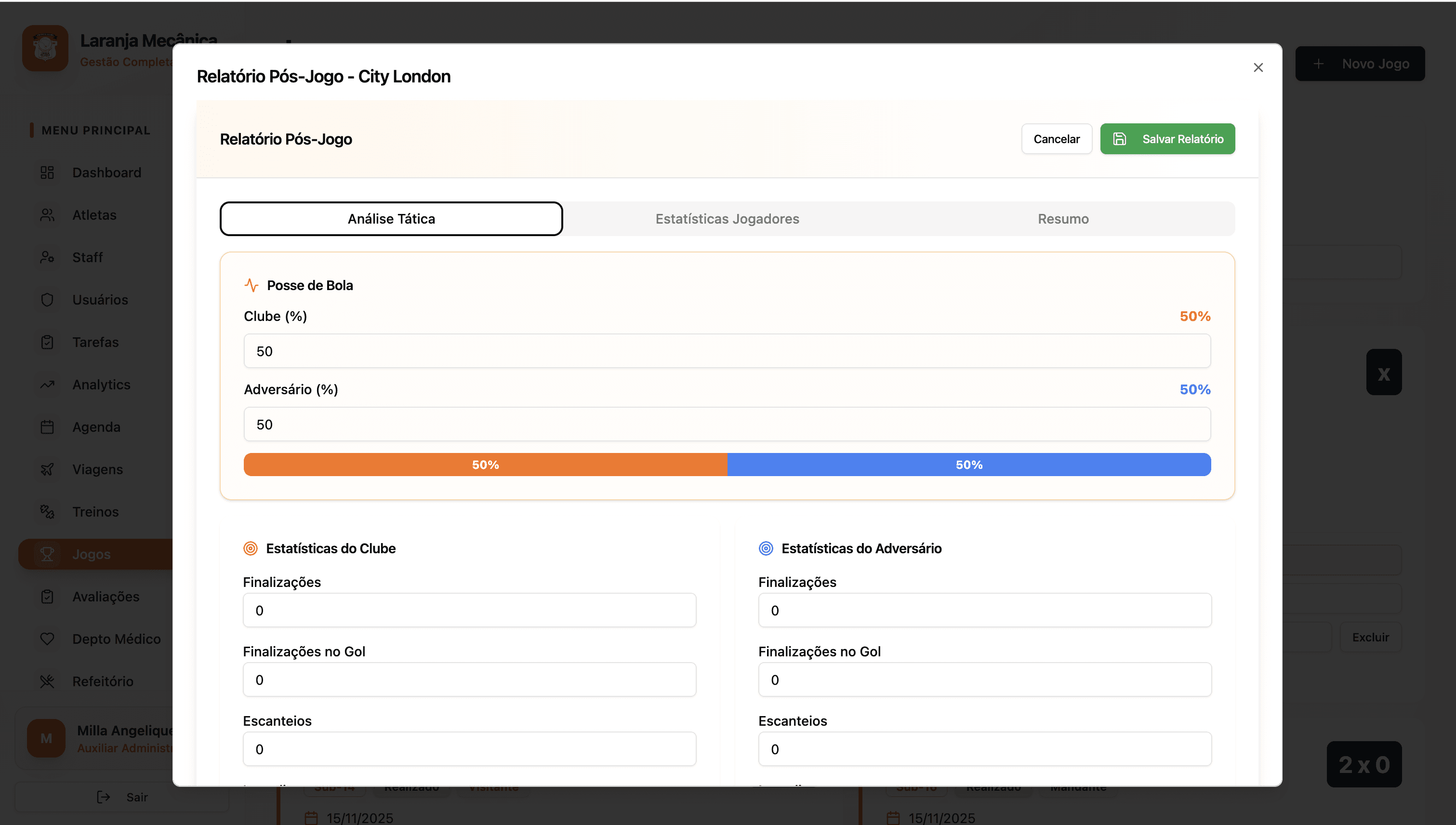 Carga de treino, wellness, indicadores físicos e avaliações: tudo atualizado manualmente pela equipe.