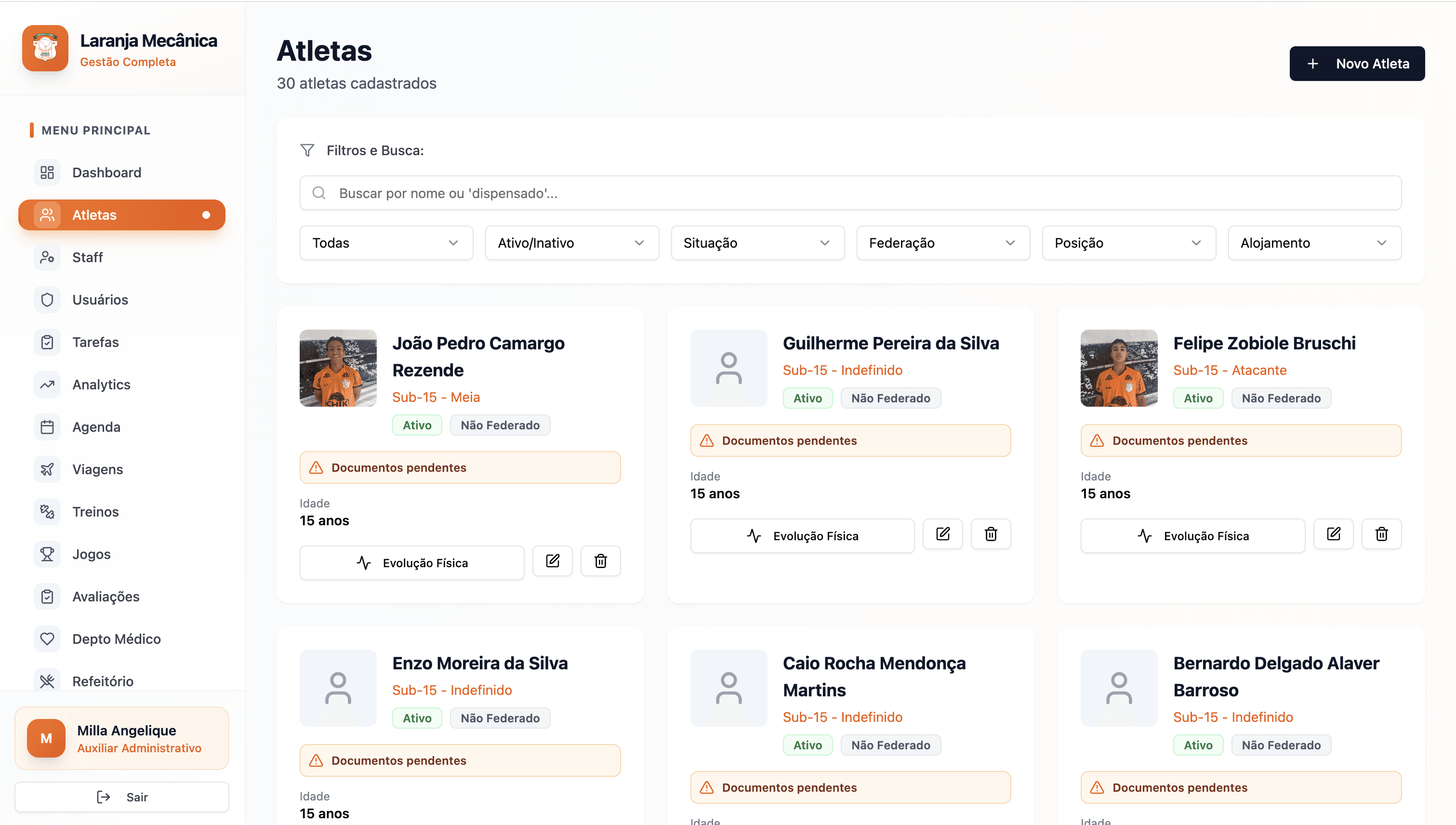 Elimine planilhas e ruído operacional. Unifique atletas, staff, documentos e processos em um único hub.